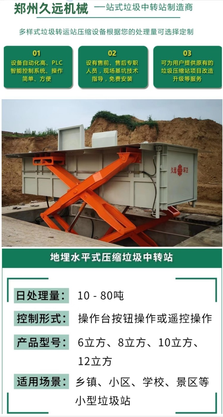水平式生活垃圾壓縮中轉(zhuǎn)設(shè)備是將垃圾的卸(出)料、壓縮、儲(chǔ)存集合在一起,整體落于地下,利用地下空間將垃圾密閉在箱體內(nèi),地面上無(wú)垃圾外露現(xiàn)象,壓縮垃圾產(chǎn)生的污水經(jīng)排污管道直接流入污水井內(nèi),然后由污水泵排到城市污水管網(wǎng),徹底解決了垃圾在收集、儲(chǔ)存、裝運(yùn)過(guò)程中的污染環(huán)境、作業(yè)效率低等問題。